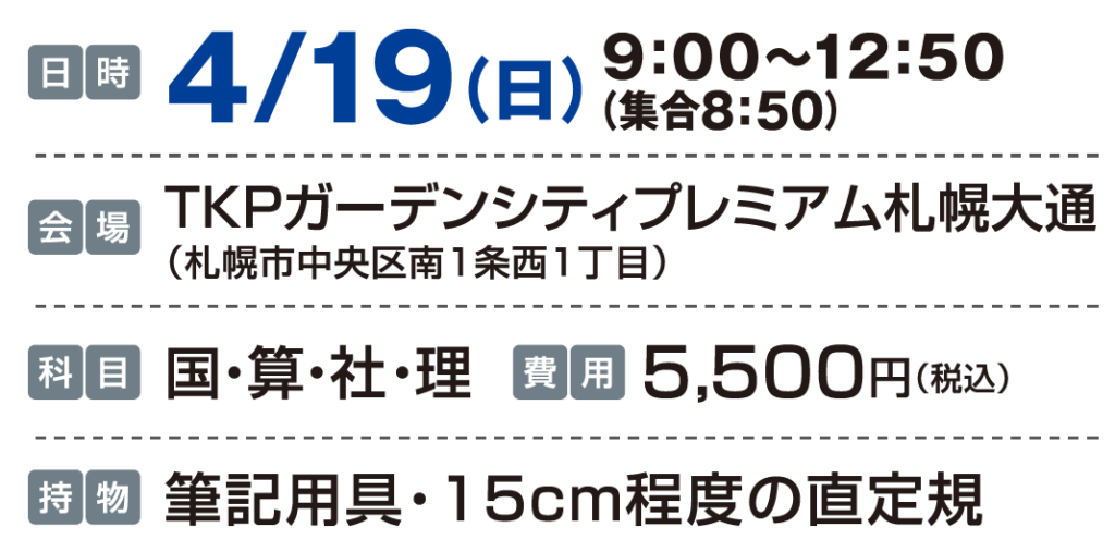 中学受験で多くの合格者を輩出している練成会グループ四谷大塚NETが主催する、道内私立中の入試傾向を踏まえた模擬試験です。合格実績が証明する入試分析力と豊富なデータで現時点での合格可能性を精密に判定します。